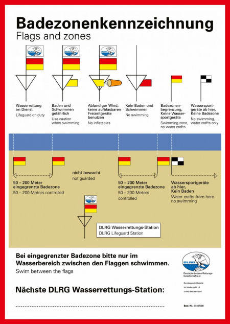 Eine rot-gelbe Flagge am Mast einer Wachstation zeigt ein gekennzeichnetes Badegebiet an, das von Rettungsschwimmern gesichert wird. Flaggen derselben Farbgebung können zusätzlich direkt am Strand angebracht werden und begrenzen dann das bewachte Badegebiet.